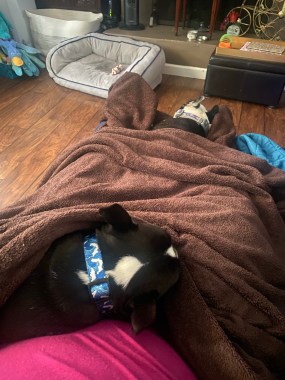 I barely dragged myself to the couch, where both Benny and Paisley snuggled in with me. Benny’s presence is not unusual, but Paisley rarely deigns to cuddle with us. I think she knew how awful I’ve been feeling.