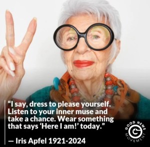 Today’s #OneGoodThing with Mama is remembering style icon Iris Apfel! May her memory be a blessing. What was your #OneGoodThing today? Please share in the comments! And remember, kindness is everything!