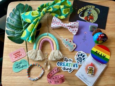 Among the first I received was a beaded bracelet that says You Are Magic. I was so touched. As I’ve been getting into sewing more lately, I’m obsessed with the measuring tape bracelet. I adore the beautiful hanging rainbow, which resonated with my creative spirit. The puppy bow tie with hearts looks very cute on Benny. And each special treasure reminds me of the wonderful person who made it. Thank you, Craftcationers, for sharing your spirit and your handmade treasures with me!