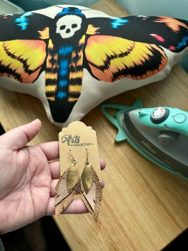 Part of what I most enjoy in selling homemade goods is trading with other vendors. Mama and I did this a lot when we made embellished bustiers. I enjoyed getting a taste of that again at the end of Craftcation. I traded my ACE Recovery Balm for these gorgeous metallic leather earrings, a super cool Death Moth pillow, and a lightweight turquoise iron.