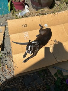 I met a dear little French bulldog, Kayla, yesterday, also a service dog for her owner. Kayla was having a day off, so she was able accept as many pats as I could give her. She was a rescue dog, had previously been owned by a registered breeder. Kayla developed fertility problems after the first litter, so her new owner happily took her into their home. Kayla’s daughter, Lily, will soon join her mother. I wish I could be there to see the reunion of mother and daughter.
