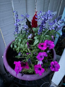 Temperatures reached triple digits today. I’ve been scrambling to get my plant starts potted during cooler hours, but sadly a few succumbed to the heat. I was glad to be able to save a few and get them planted just as it got dark. Normally I stick to one plant per pot, but needs must. I like how it turned out.