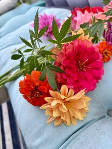 Compared with previous years, there aren’t many flowers in the garden this season—except these! But I’m trying not to beat up on myself as it’s been a hell of a summer. I lost some plants during my first hospitalization and didn’t have the energy to plant much this year. But I pulled together this lovely tiny bouquet comprised of nearly all this summer’s flowers and brought it inside. I love it!