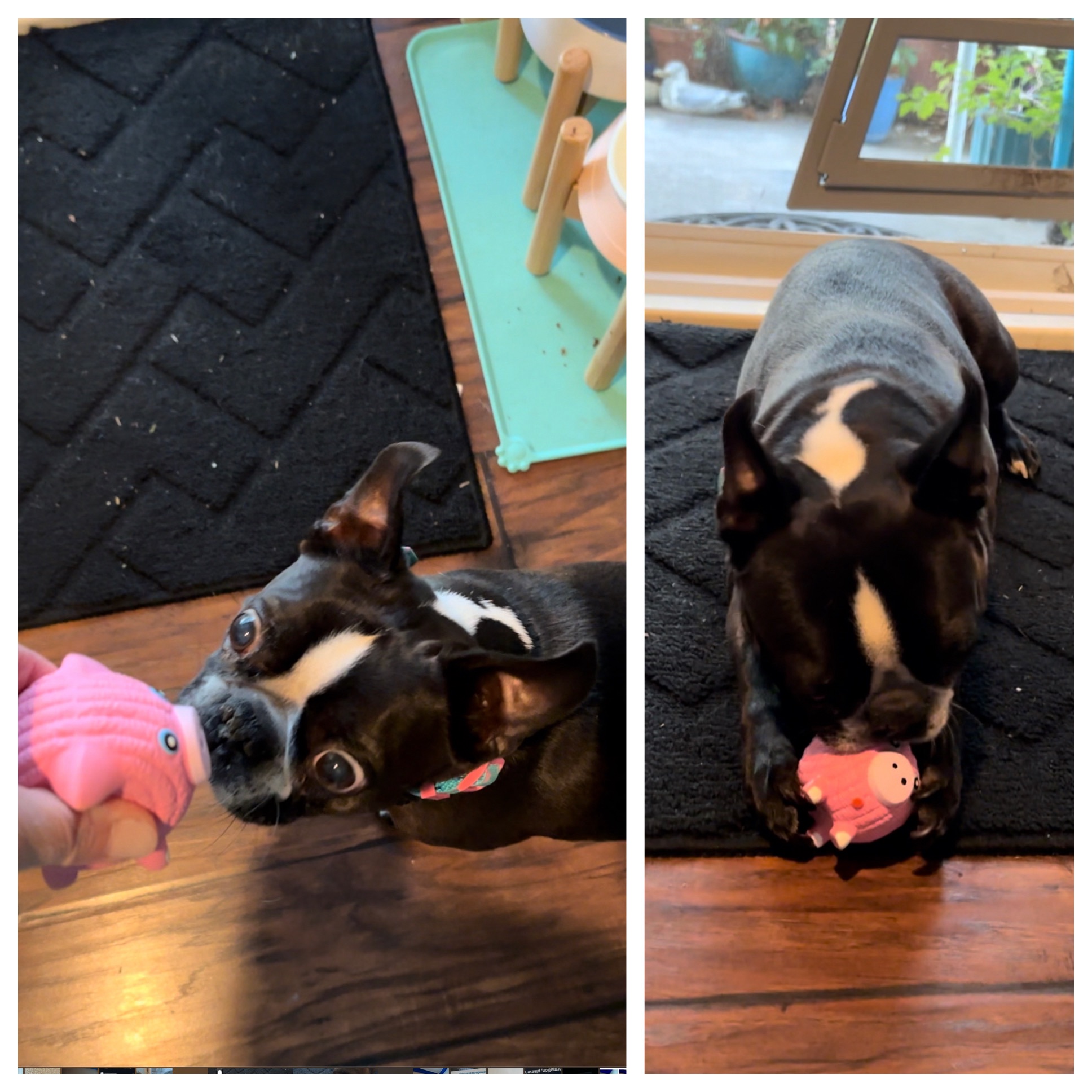 Most of Benny’s accoutrements (toys, clothes, beds) are hand-me-downs from our previous Bostons. But my sweet boy fell in love with this cute squeaky pig at the hardware store yesterday. Since it was only $5, it came home with us. Benny loves the noise and I still find it more funny than annoying.