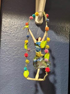 This beautiful little sculpture is by the artist Sarena Mann. The woman is wearing a Starry Night print dress and standing on a flowered swing. I love this piece of art and seeing it makes me smile.