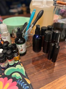 Tonight I took the leap and finally mixed up a batch of Massage & Body Oil based on my popular Recovery Balm. I poured it into various sized glass bottles with a pump and rollers. Now is the fun part of testing it!