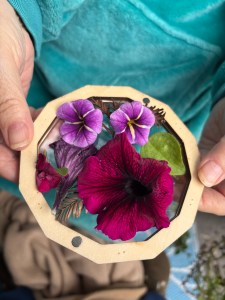 This time I brought a beautiful wooden DIY kaleidoscope. We filled it with flowers, leaves, and needles from Mama’s balcony garden. We had fun with it!