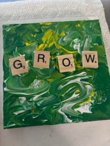 While at Craftcation last month, I attended a workshop on abstract layered painting. I couldn’t wait to get home and try it again with more paint. Since Mama and I will be doing it as our Mother’s Day craft, I did a test round today. I loved it!